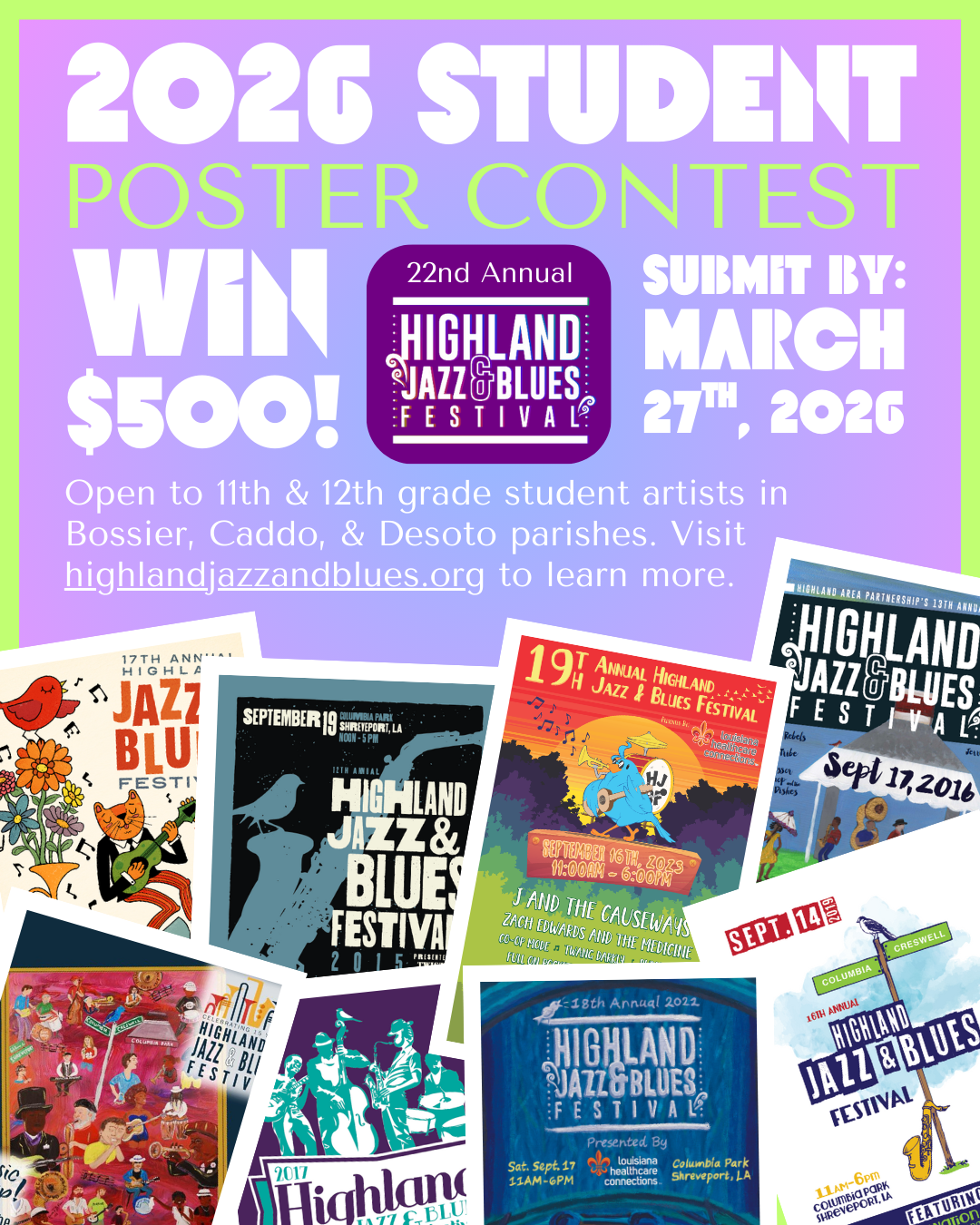 Winner will be notified by April 10, 2026 and official artwork will be revealed to the public at the Official Highland Jazz and Blues Announcement Party in late April 2026.